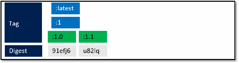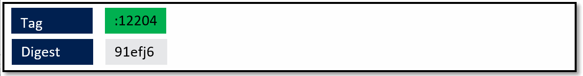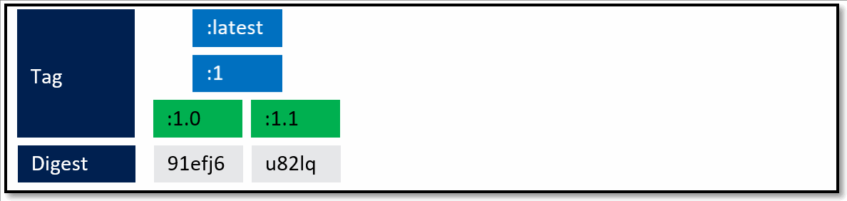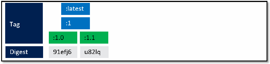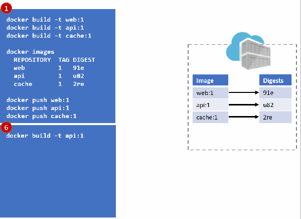 web:1, api:1, cache:1. Looking closely, we can see every tag has an ID, otherwise known as a digest. - When the images are pushed to a registry, they are stored as two parts. The image:tag, and the underlying digest. These are actually separate elements, with a pointer between them.