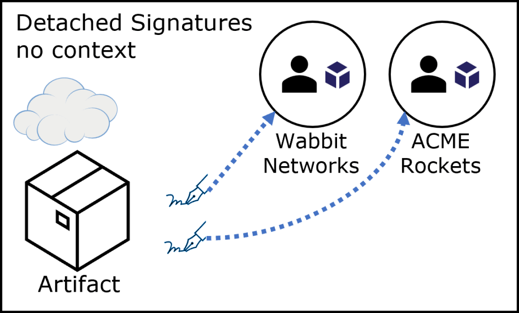 If the signature is embedded within the artifact, there’s a clear association. The issuer of the signature produced the artifact. That has real meaning. Consider what it takes to evaluate the signature to assure it’s from a trusted identity. Evaluating an attached signature is a classic trojan horse opportunity. To verify the signature, you must first take possession of the artifact to extract and evaluate the signature. You may determine the signature is invalid, or from a known bad actor. However, once you’ve downloaded the artifact, all it takes is another attack vector to access or activate it.